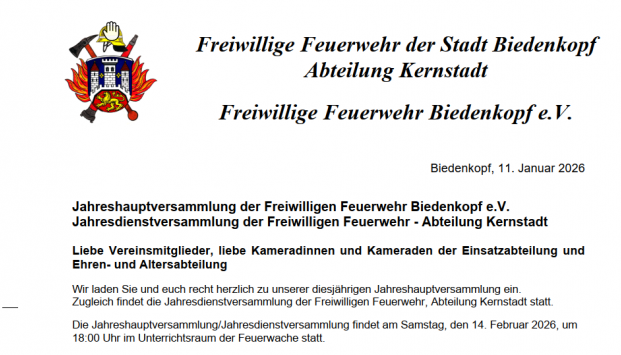 Der Feuerwehrverein und die Abteilung Kernstadt der Freiwilligen Feuerwehr der Stadt Biedenkopf laden Euch und Sie herzlich zur gemeinsamen Jahreshauptversammlung für das Berichtsjahr 2025 ein.