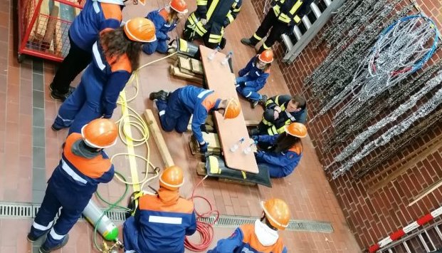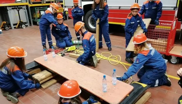 ...so lautete das Übungsthema gestern. Aufgabe war es einen Tisch anzuheben ohne eine Berührung durch die Jugendlichen und ohne ein Umfallen der Wasserflaschen. Zur Verfügung stand der komplette AB-Rüst. Die Jugendlichen haben dabei mehrere Varianten diskutiert und ausprobiert. Am Ende haben wir die Vor- und Nachteile und die Handhabung diverser Hebemittel ausprobiert. Vom Spaten bis zum Hebekissen war alles dabei.